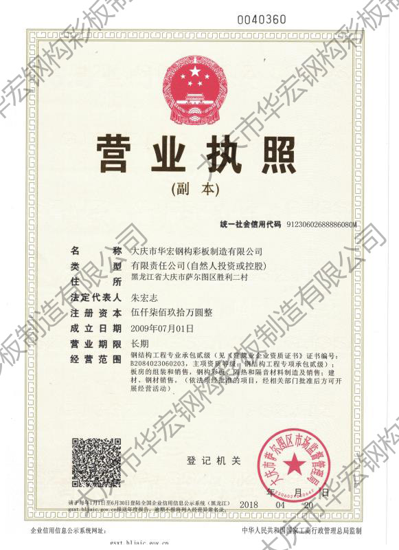 華宏鋼構(gòu)始建于2009年8月9日,總部位于大慶市薩爾圖區(qū)南一路13號(hào),現(xiàn)有大慶市華宏鋼構(gòu)彩板制造有限公司、黑龍江省華宏力安綠建科技有限公司、大慶市華宏鋼構(gòu)彩板制造有限公司長(zhǎng)春分公司、黑龍江省海森新材料科技有限公司、大慶市瑞和通螺栓廠(chǎng)五家工業(yè)企業(yè)形成了以彩板復(fù)合板、裝配式鋼結(jié)構(gòu)建筑、保溫材料、配件制造為主的五大生產(chǎn)基地,占地總面積 20余萬(wàn)平方米,生產(chǎn)車(chē)間5萬(wàn)平方米。中高層管理干部26 人,高級(jí)工程師9人,各類(lèi)國(guó)家注冊(cè)執(zhí)業(yè)人員 32 人,車(chē)間技工 260人,專(zhuān)業(yè)安裝隊(duì)伍 10 余支,帶動(dòng)就業(yè) 500